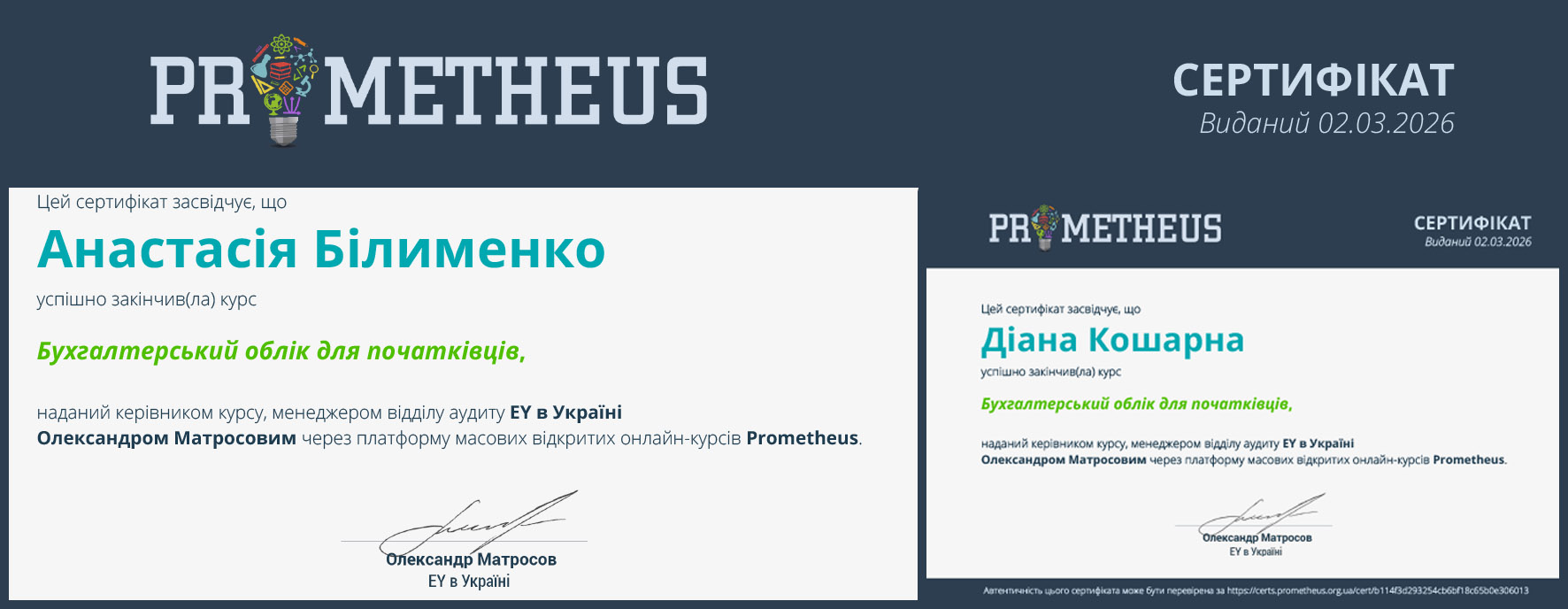 Важливим етапом професійного становлення студентів стало успішне завершення сертифікованого курсу «Бухгалтерський облік для початківців», реалізованого на платформі масових відкритих онлайн-курсів Prometheus.