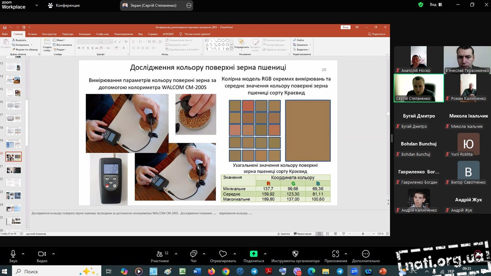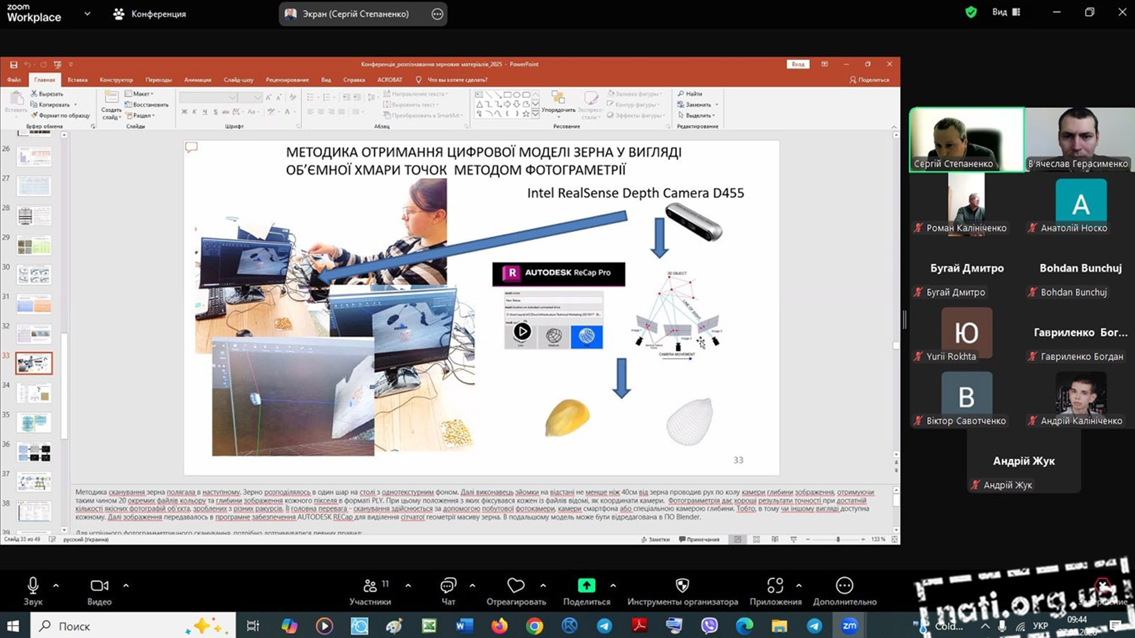 У ході лекції було розглянуто сучасні підходи до автоматизованого контролю якості зерна та зернових сумішей із застосуванням систем машинного зору. Лектор детально зупинився на принципах побудови оптичних систем, алгоритмах цифрової обробки зображень, методах сегментації та класифікації частинок, а також на можливостях використання нейронних мереж для розпізнавання дефектів, домішок і фракційного складу зернової маси.