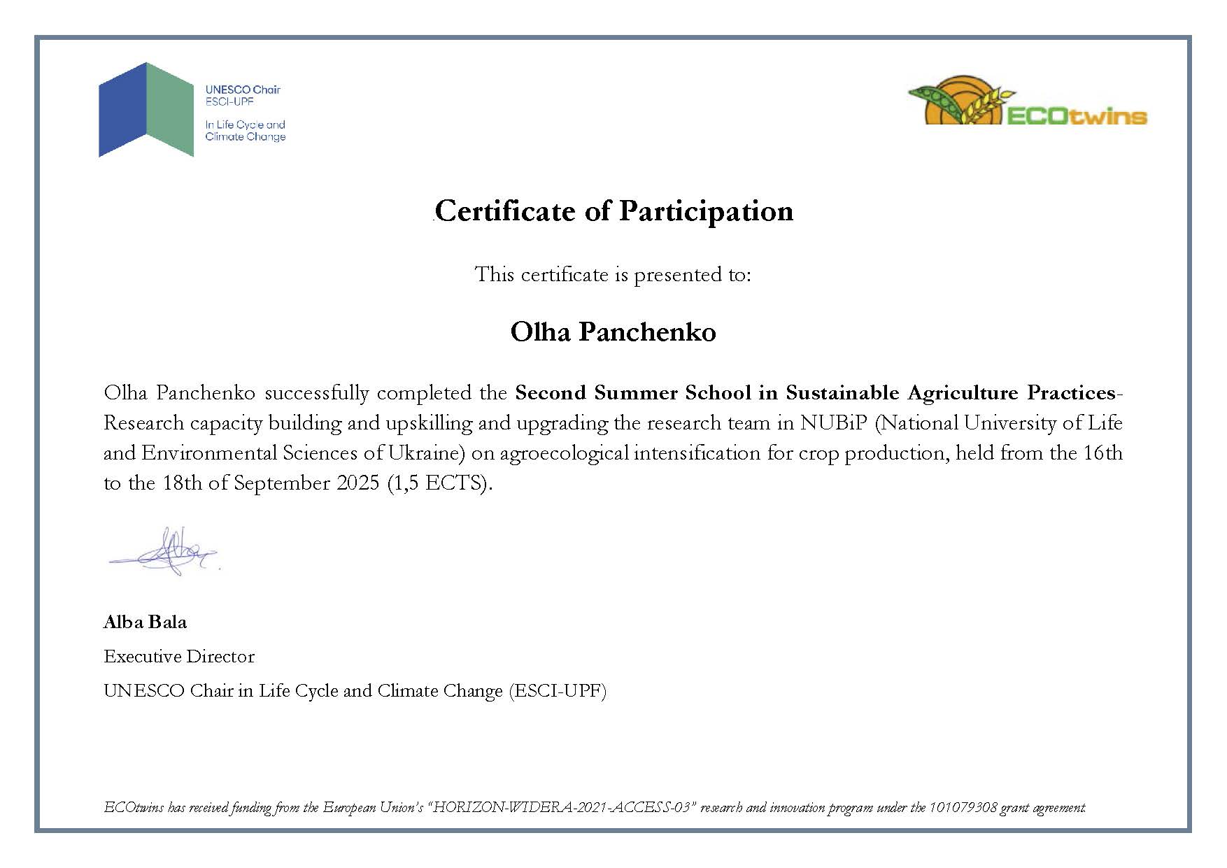 ННЦ «Інститут аграрної економіки». Підвищення кваліфікації відповідно до загальної тематики «Актуальні питання сучасного розвитку аграрної сфери економіки» Сертифікат № 120525083 від 23 травня 2025 року.