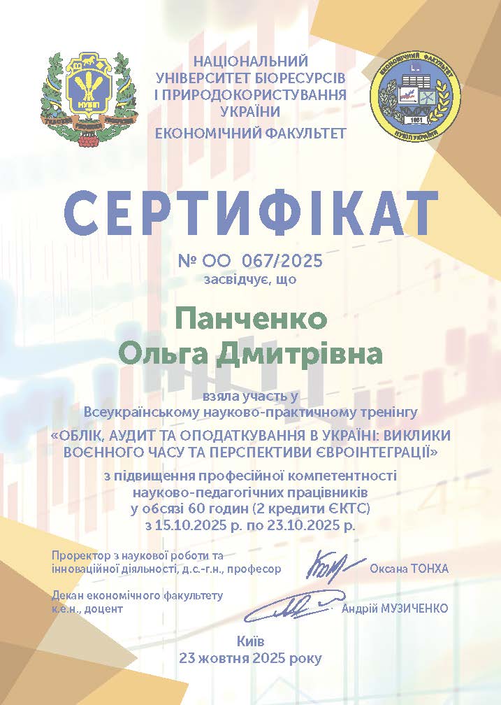 Національний університет біоресурсів і природокористування України, кафедра обліку та оподаткування. Всеукраїнський науково-практичний тренінг «Облік, аудит та оподаткування в Україні: виклики воєнного часу та перспективи євроінтеграції». Сертифікат № ОО 067/2025.