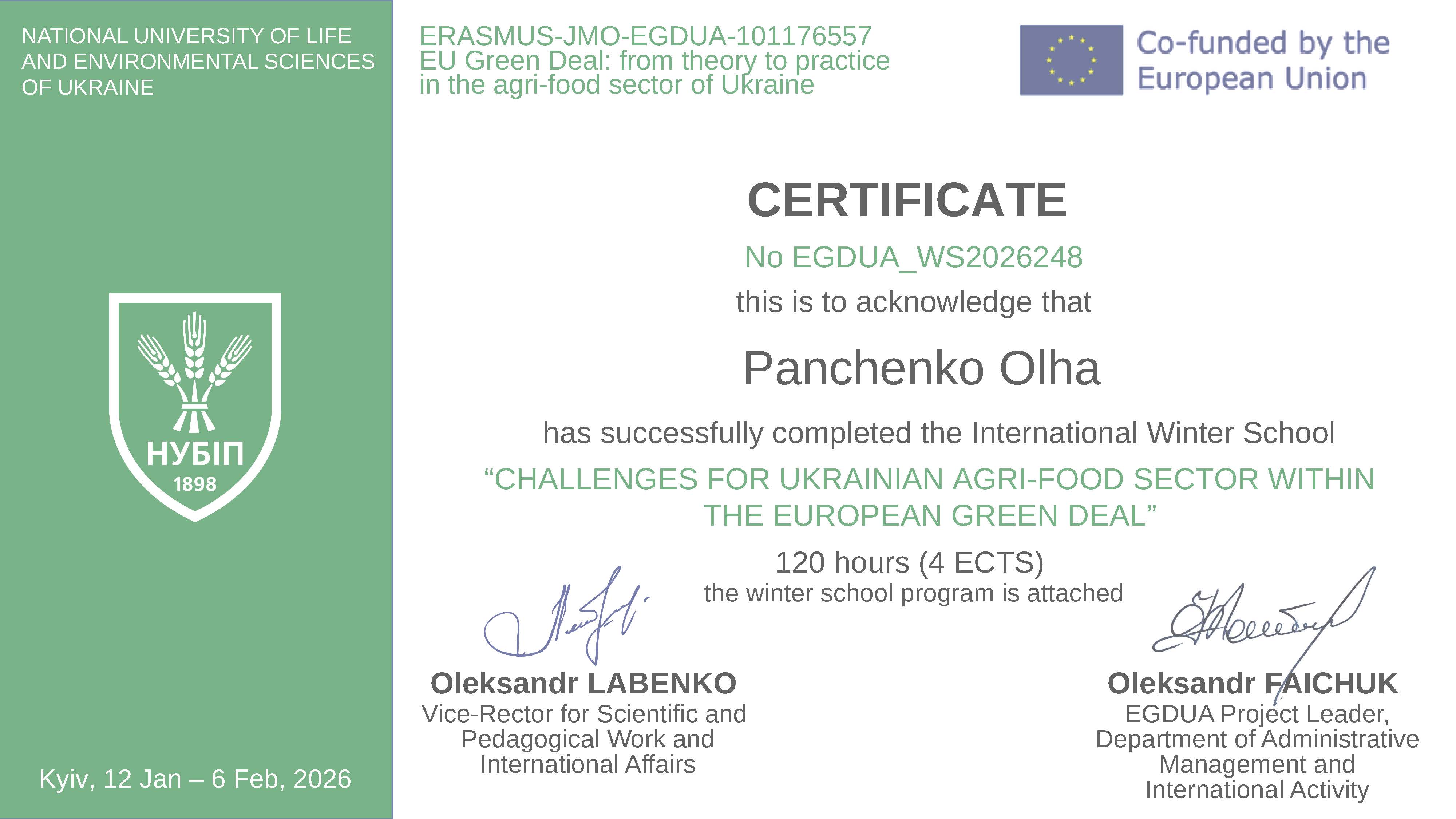 National University of Life and Environmental Sciences of Ukraine. Challenges for ukrainian agri-food sector within the European green deal. Certificate No EGDUA_WS2026248.