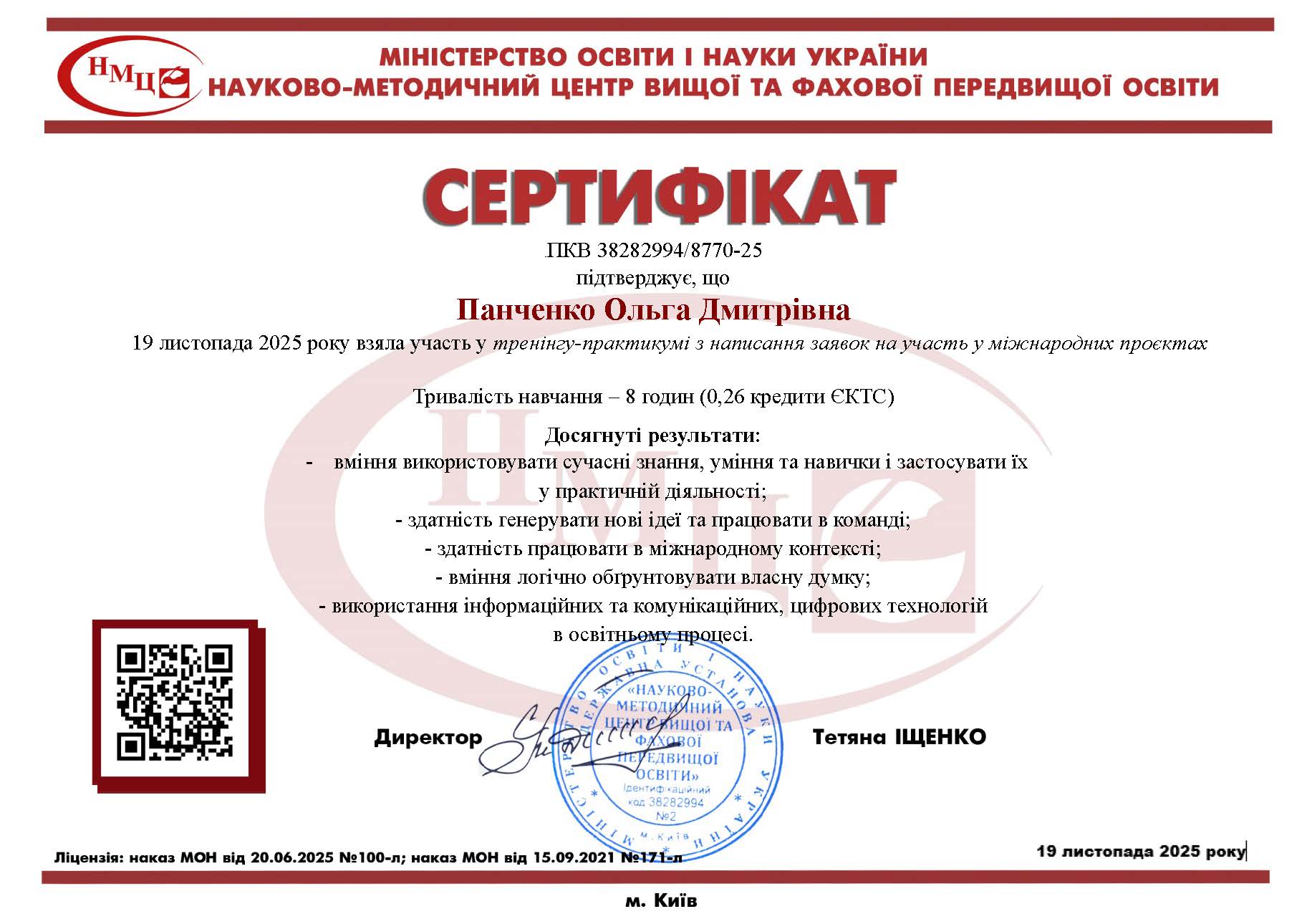 Науково-методичний центр вищої та фахової передвищої освіти. Тренінг-практикум з написання заявок на участь у міжнародних проєктах. Сертифікат ПКВ 38282994/8770-25.