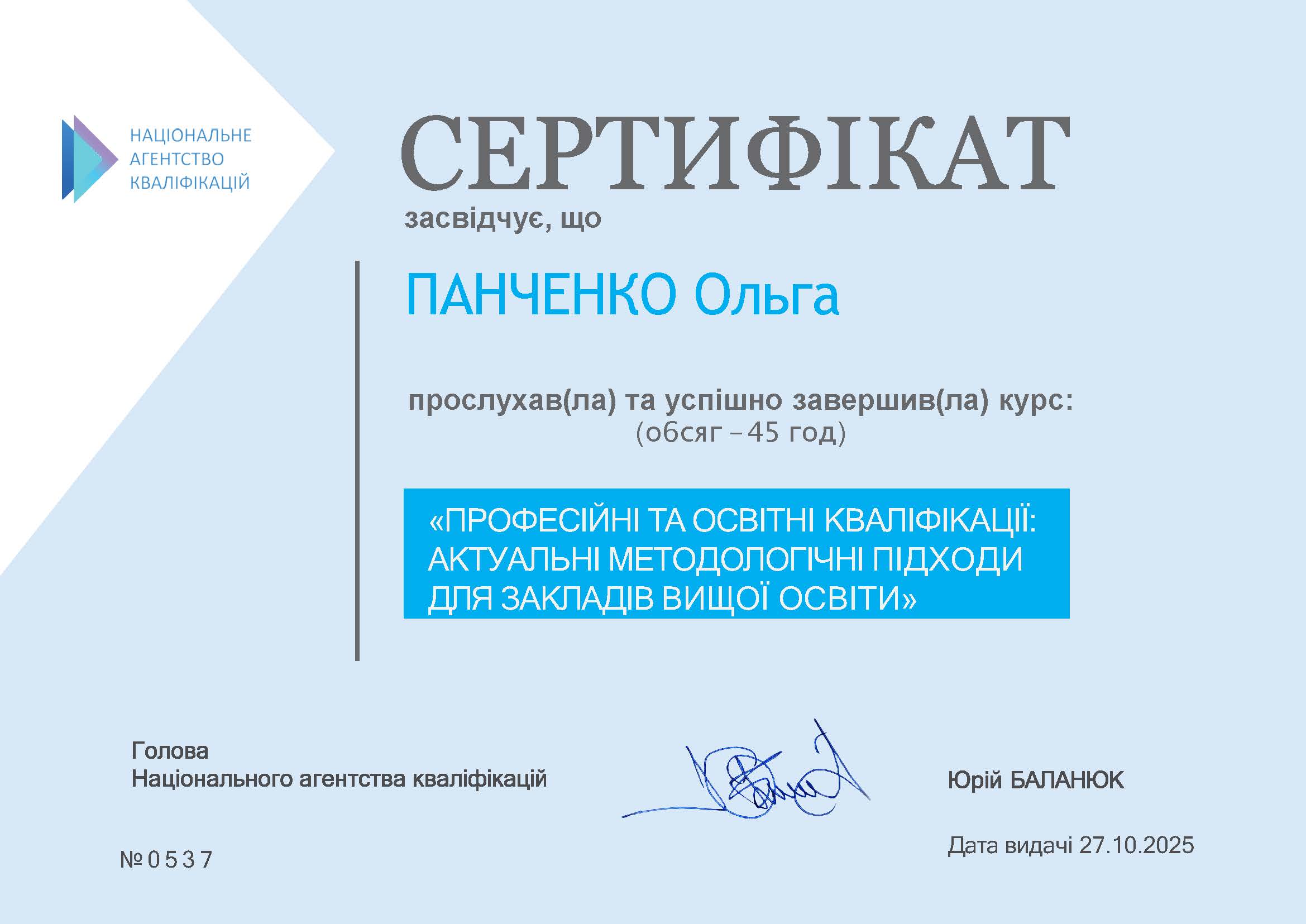 Національне агентство кваліфікацій. Професійні та освітні кваліфікації: актуальні методологічні підходи для закладів вищої освіти. Сертифікат № 0537 від 27.10.2025.
