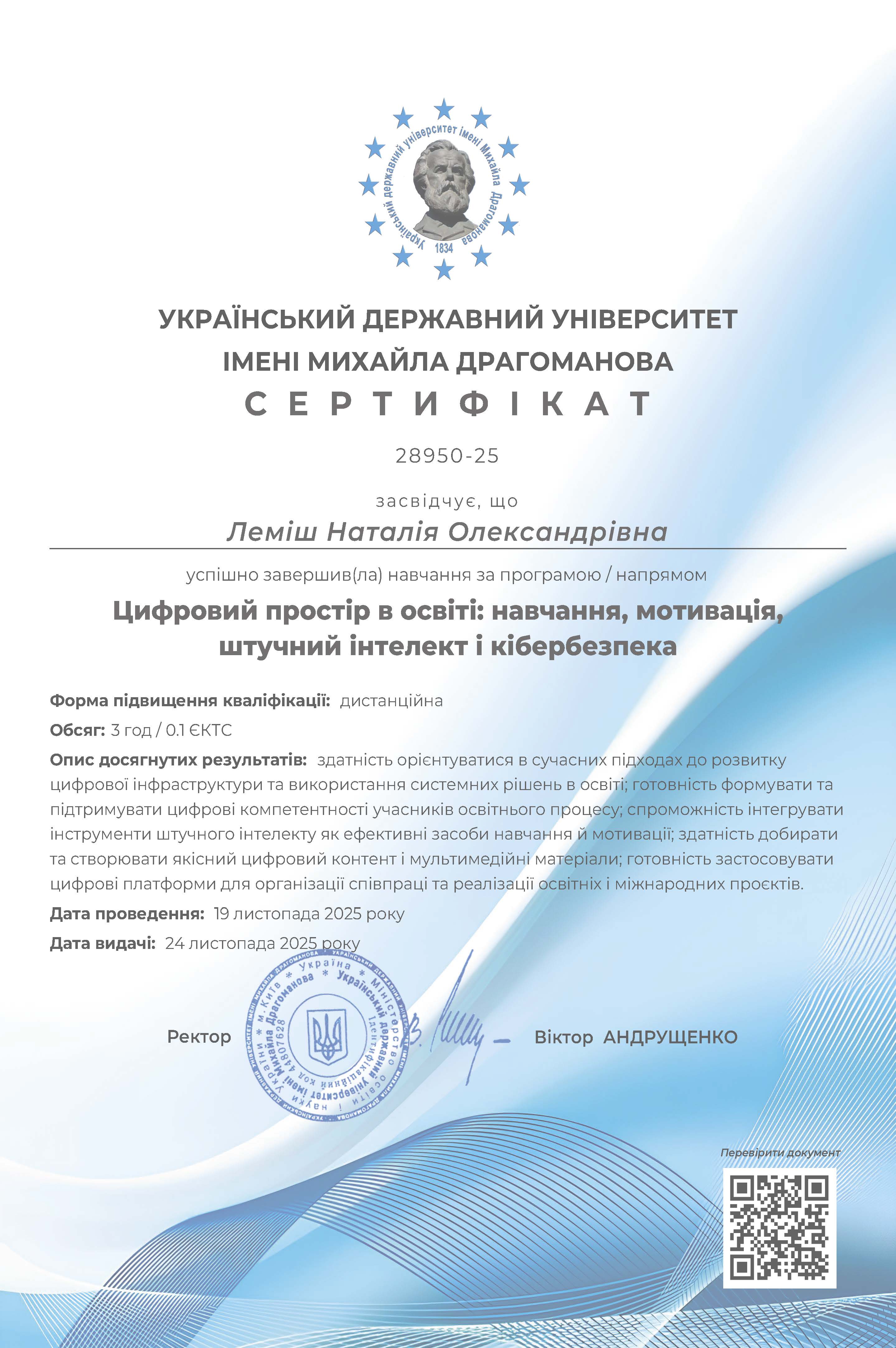 Сертифікат про проходження курсу «Цифровий простір в освіті: навчання, мотивація, ШІ і кібербезпека» - 19.11.2025 року