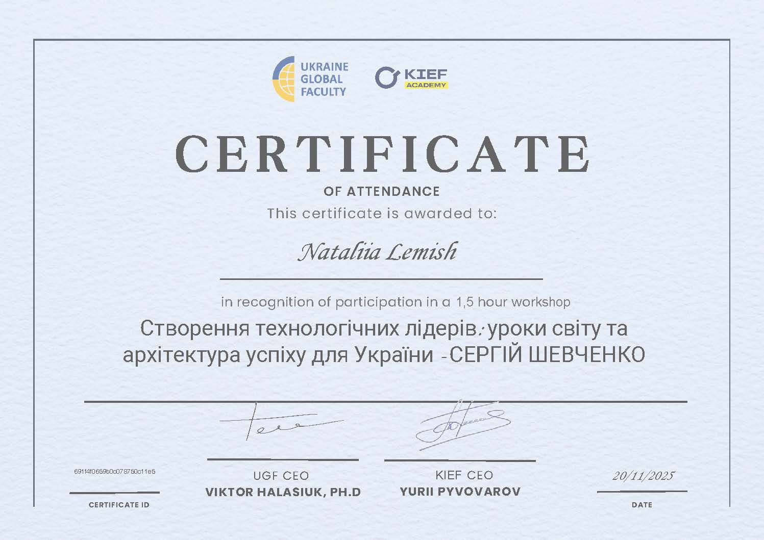 ТОВ «Академія цифрового розвитку», «Цифрові інструменти Google для закладів вищої, фахової передвищої освіти», Сертифікат № 19GW-137 від 19.10.2021 р., 30 годин / 1 кредит ЄКТС.