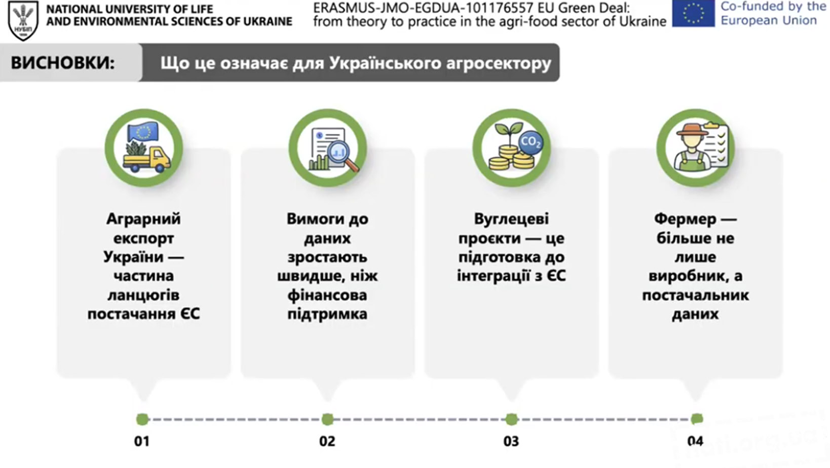 Учасники поглибили знання щодо нової Спільної аграрної політики ЄС, зокрема правових засад її реалізації, інструментів державної підтримки, зелених субсидій, екоумовностей та обов’язкових управлінських вимог. Отримані знання є вагомими для формування рекомендацій щодо адаптації діяльності українських агровиробників до європейських стандартів.