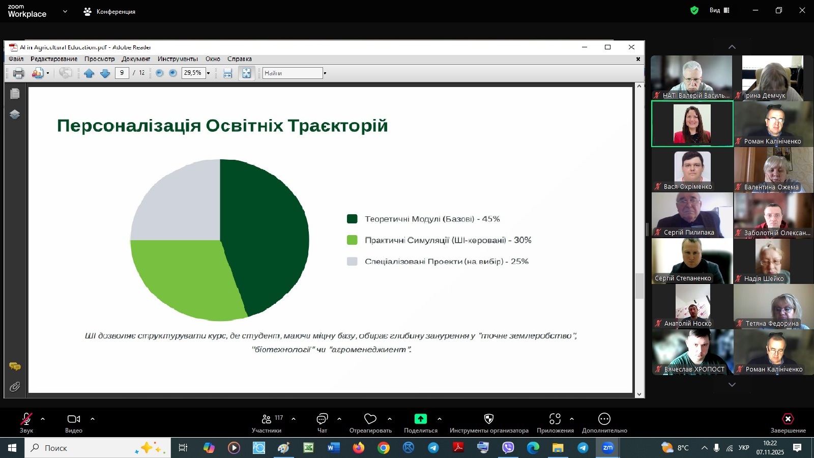 Доктор технічних наук, доцент кафедри нарисної геометрії, комп'ютерної графіки та дизайну НУБіП України Тетяна Воліна у своїй доповіді «Планування та структурування освітнього процесу засобами штучного інтелекту в аграрних навчальних закладах» презентувала інноваційний погляд на трансформацію аграрної освіти. Вона не просто констатувала факт існування ШІ, а запропонувала конкретні шляхи та механізми його впровадження для створення більш гнучкого, орієнтованого на студента та професійно релевантного освітнього процесу в аграрних навчальних закладах.