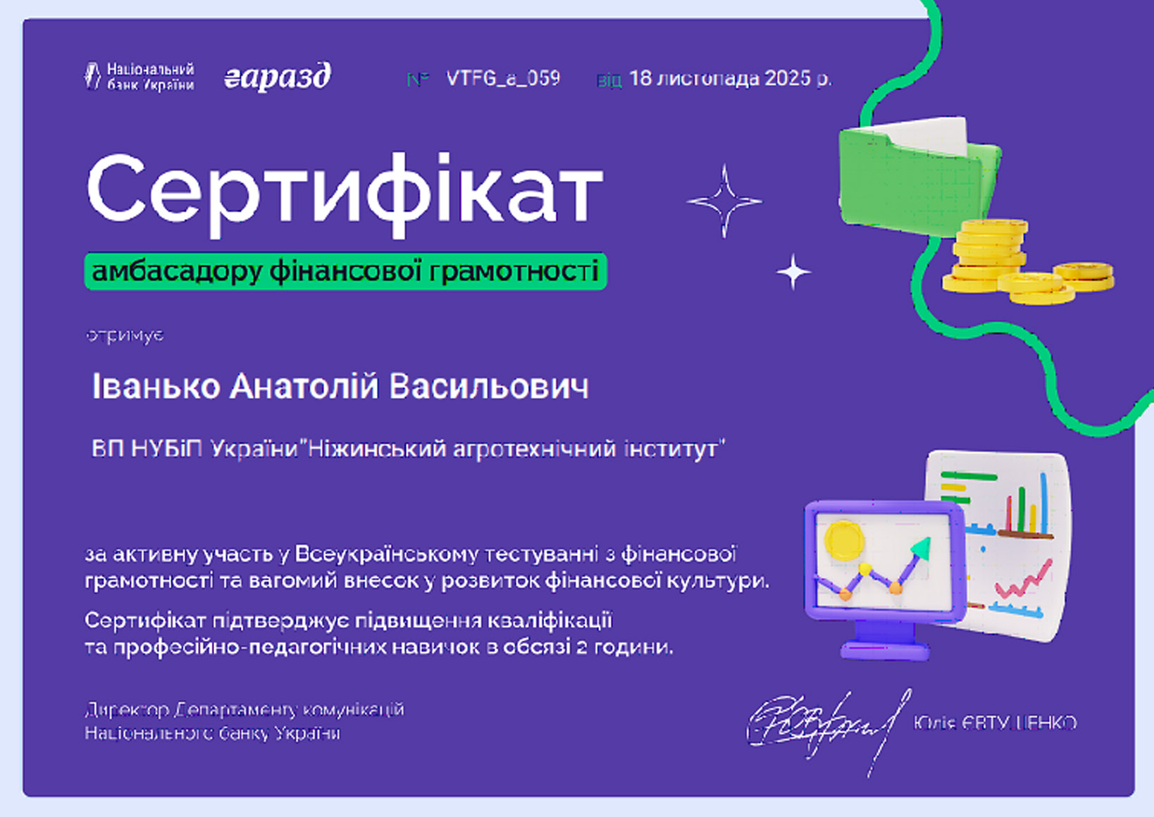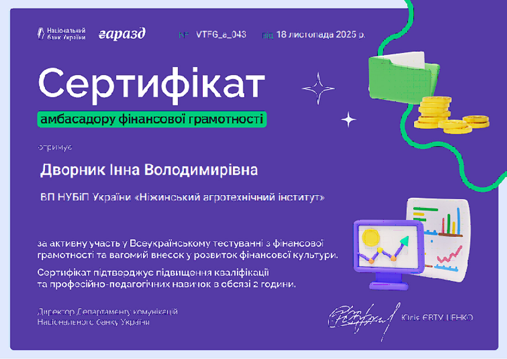 Маємо приємні результати: науково-педагогічні працівники кафедри менеджменту та аграрної економіки отримали сертифікати амбасадорів фінансової грамотності.