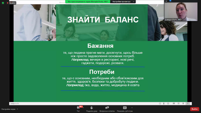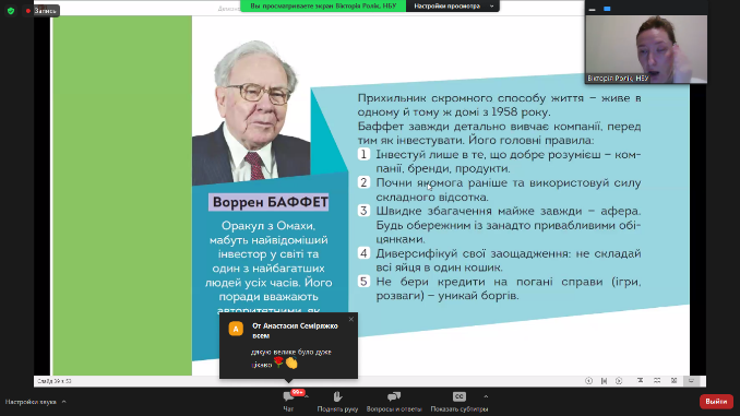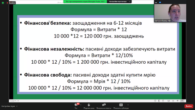 28 жовтня науково-педагогічні працівники кафедри менеджменту та аграрної економіки та здобувачі освіти економічних спеціальностей узяли участь у практичному воркшопі «Мій фінансовий план» від головного експерта управління зв’язків з громадськістю та фінансової обізнаності Департаменту комунікацій НБУ Вікторії РОЛІК в онлайн-форматі.