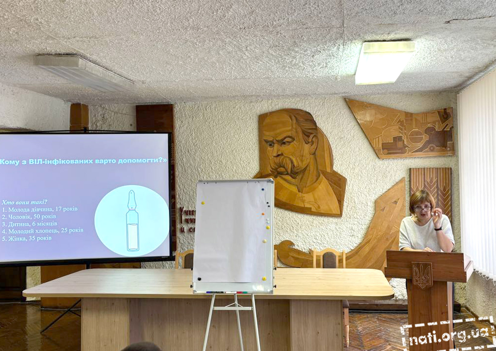 Пані Наталія також провела інтерактивне опитування. Студентам запропонували відповісти: «Кому з ВІЛ-інфікованих варто допомогти?», поступово розширюючи інформацію про цих людей — їхній вік, життєві історії, сімейні обставини. Це дало змогу учасникам усвідомити, що ВІЛ може торкнутися будь-кого, і що жодна людина не повинна залишатися без підтримки чи співчуття.
