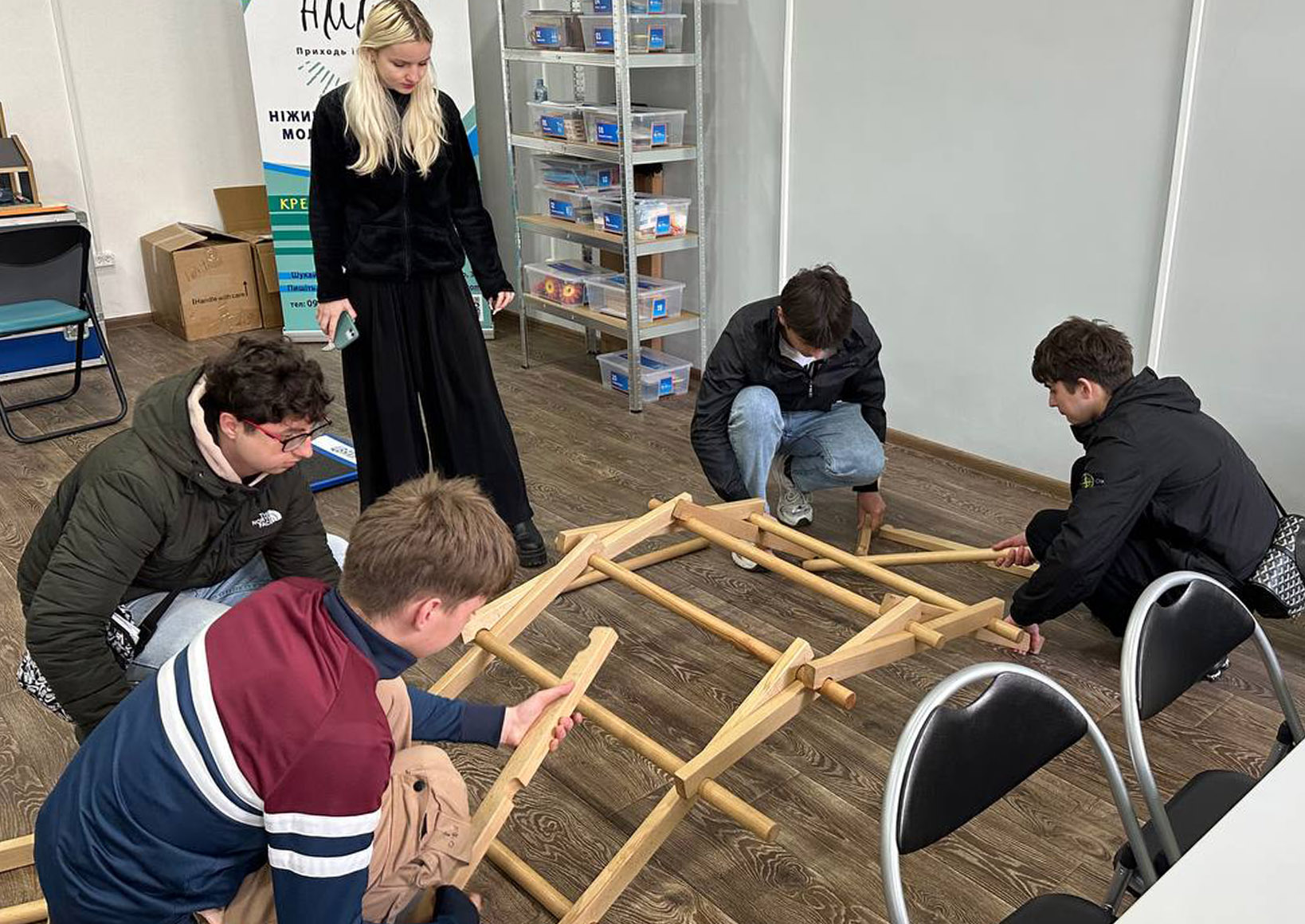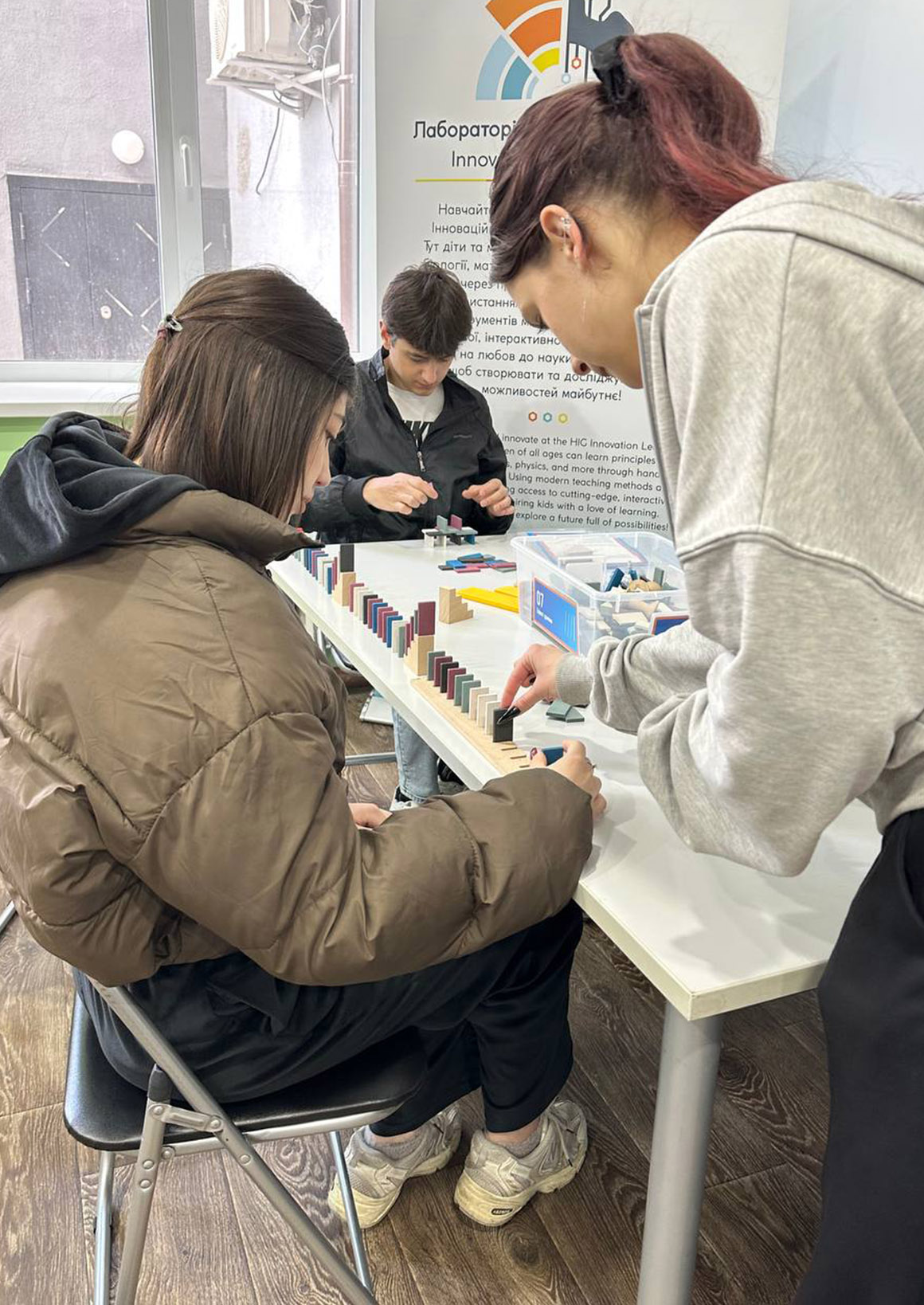 Під час перебування у Зоні креативності, яка функціонує на базі Ніжинської ЗОШ І–ІІІ ступенів №7, студенти долучилися до різноманітних практичних занять. Зокрема, вони досліджували принцип доміно та особливості передачі руху, виконували завдання з вузлами для розвитку просторового мислення і дрібної моторики, а також експериментували з рівновагою тіл і центром мас.