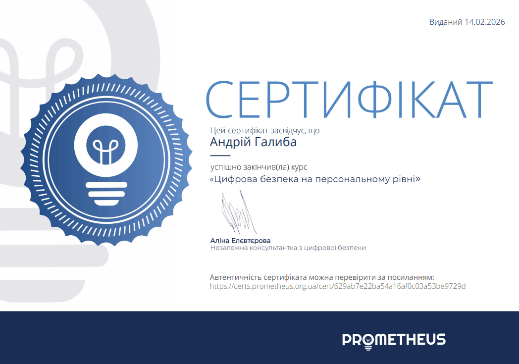 У межах вивчення дисципліни «Інформаційні технології та ГІС», а також з метою підвищення цифрової компетентності, студенти груп БМ221 та БМ233ск успішно пройшли онлайн-курс «Цифрова безпека на персональному рівні» на платформі Prometheus.