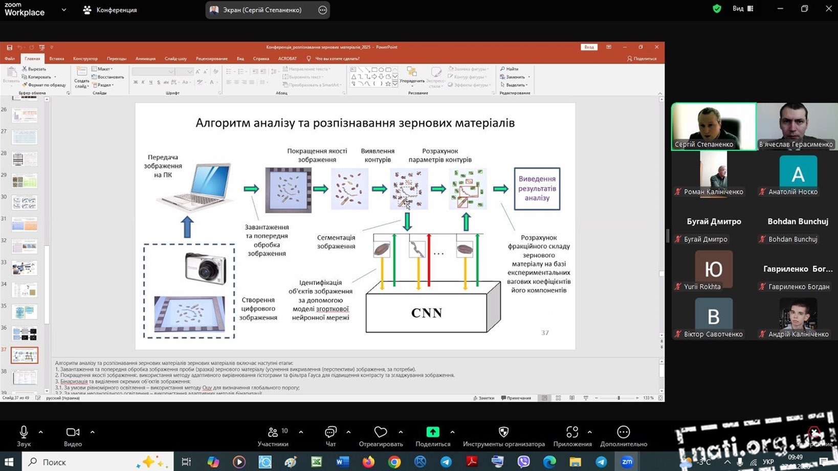 У ході лекції було розглянуто сучасні підходи до автоматизованого контролю якості зерна та зернових сумішей із застосуванням систем машинного зору. Лектор детально зупинився на принципах побудови оптичних систем, алгоритмах цифрової обробки зображень, методах сегментації та класифікації частинок, а також на можливостях використання нейронних мереж для розпізнавання дефектів, домішок і фракційного складу зернової маси.