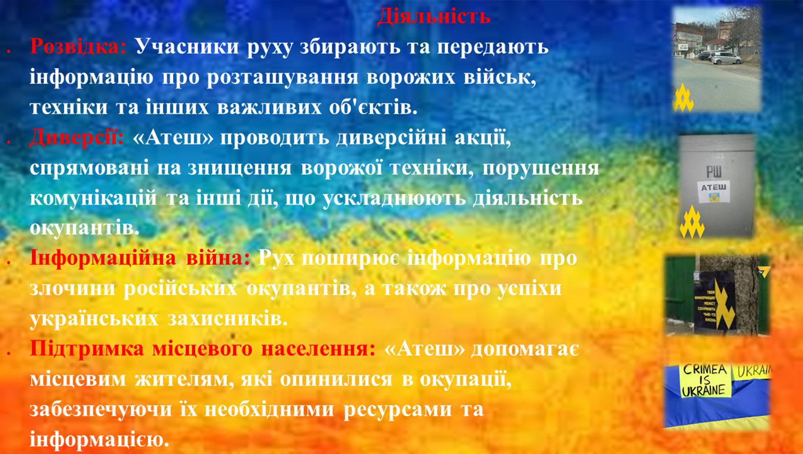 Віктор Литовченко розповів про діяльність партизанського руху «АТЕШ» та висвітлив роль сучасного підпілля як прямого продовження багатовікової національно-визвольної боротьби за незалежність України. Основна увага була приділена методам спротиву в Криму та на інших окупованих територіях: від стратегічної розвідки та передачі координат ворожих об'єктів Силам оборони до актів саботажу на залізниці та всередині військових частин РФ.