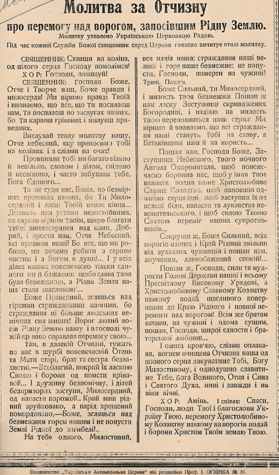 Традиція спільної молитви в часи випробувань має глибоке історичне коріння. У 1921 році, в період боротьби Української Народної Республіки проти більшовицької навали, було затверджено «Молитву за Отчизну про перемогу над ворогом, запосівшим Рідну Землю», підписану міністром ісповідань Іваном Огієнком, що засвідчила роль молитви як чинника консолідації нації.