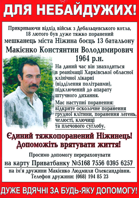 18 лютого був тяжко поранений співробітник інституту Макієнко Костянтин, який прикривав відхід бойових побратимів з Дебальцевого. Він має відкрите осколкове поранення грудної клітки, поранення легень, щелепи, ключиці та плечового суглобу. Зараз Макієнко Костянтин знаходиться в реанімаційному відділенні Харківської обласної лікарні.