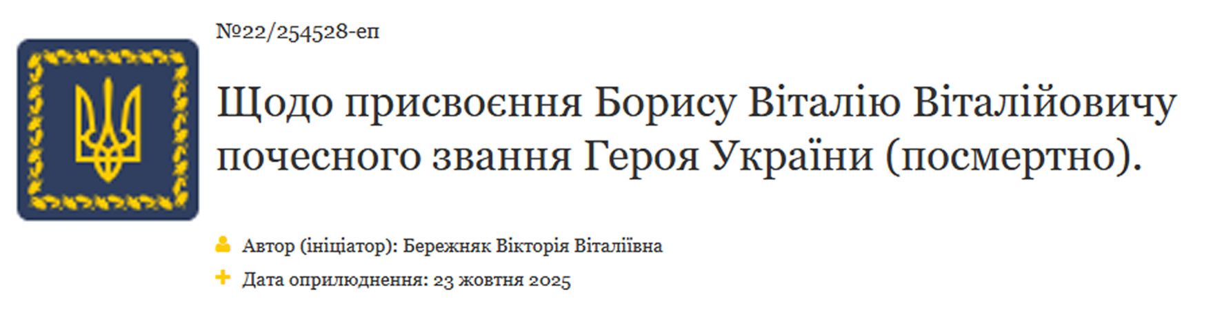Проcимо Всіх підтримати Петицію про присвоєння звання Герой України (посмертно) сержанту Борису Віталію Віталійовичу, 2000 р.н.