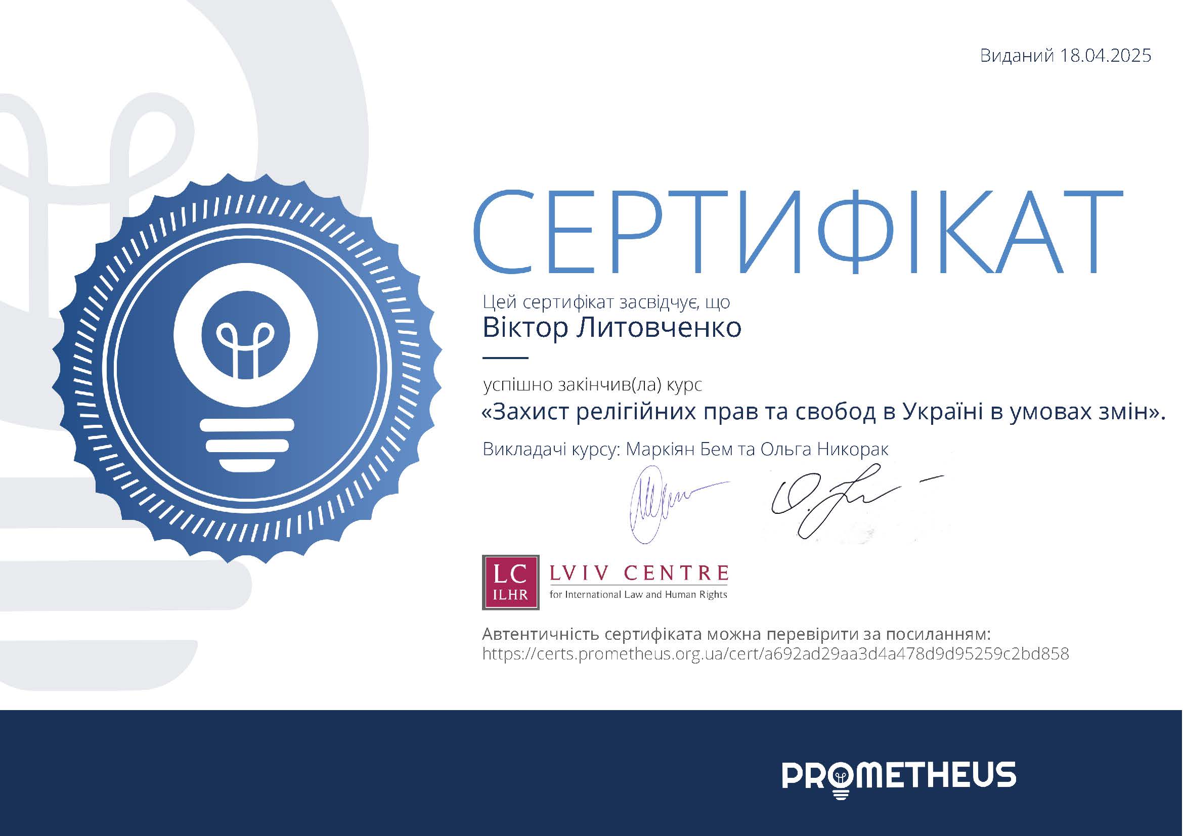 Сертифікат про успішне закінчення курсу «Захист релігійних прав та свобод в Україні в умовах змін» – Prometheus, 18.04.2025.