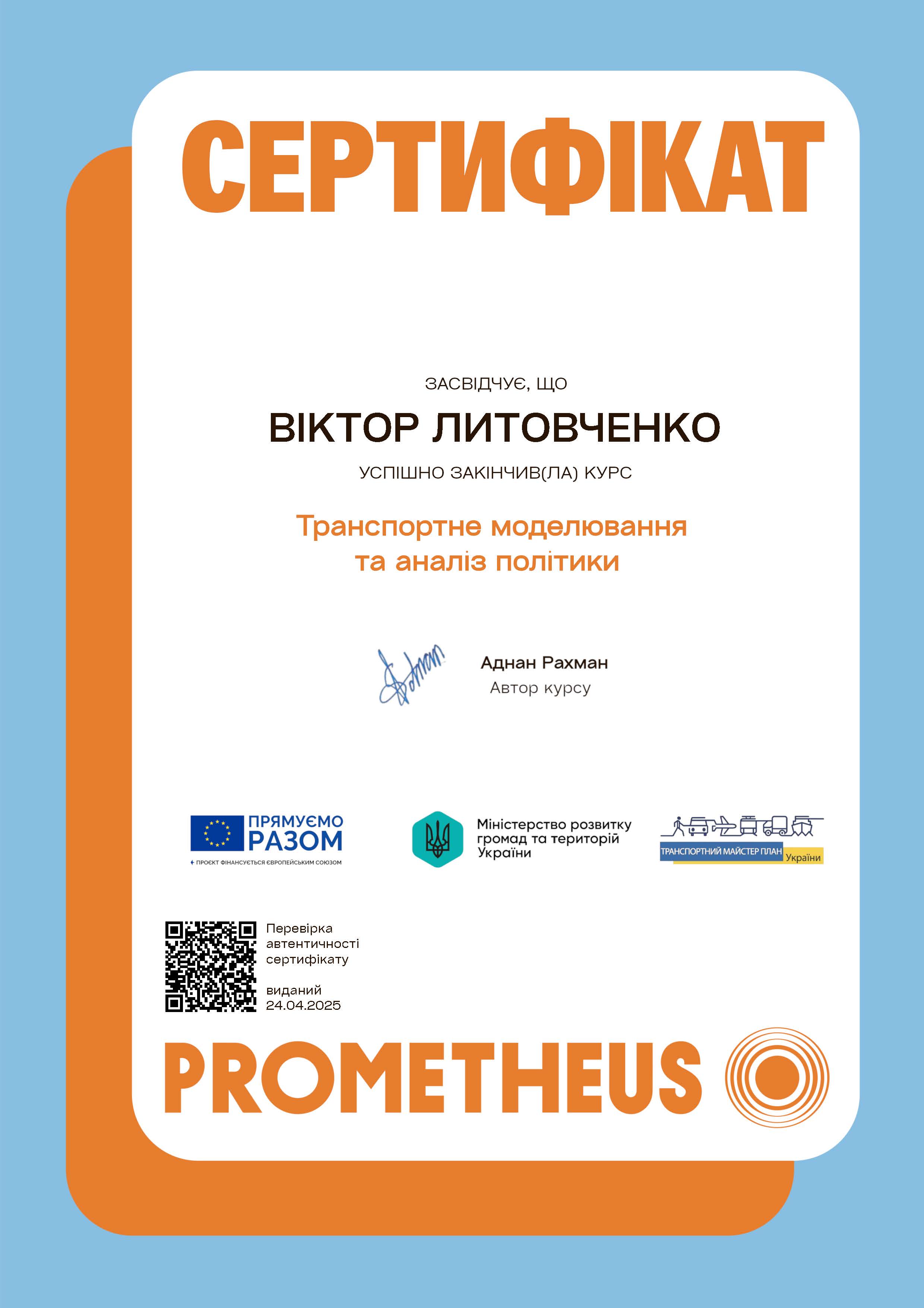 Сертифікат про успішне закінчення курсу «Транспортне моделювання та аналіз політики» – Prometheus, 24.04.2025.