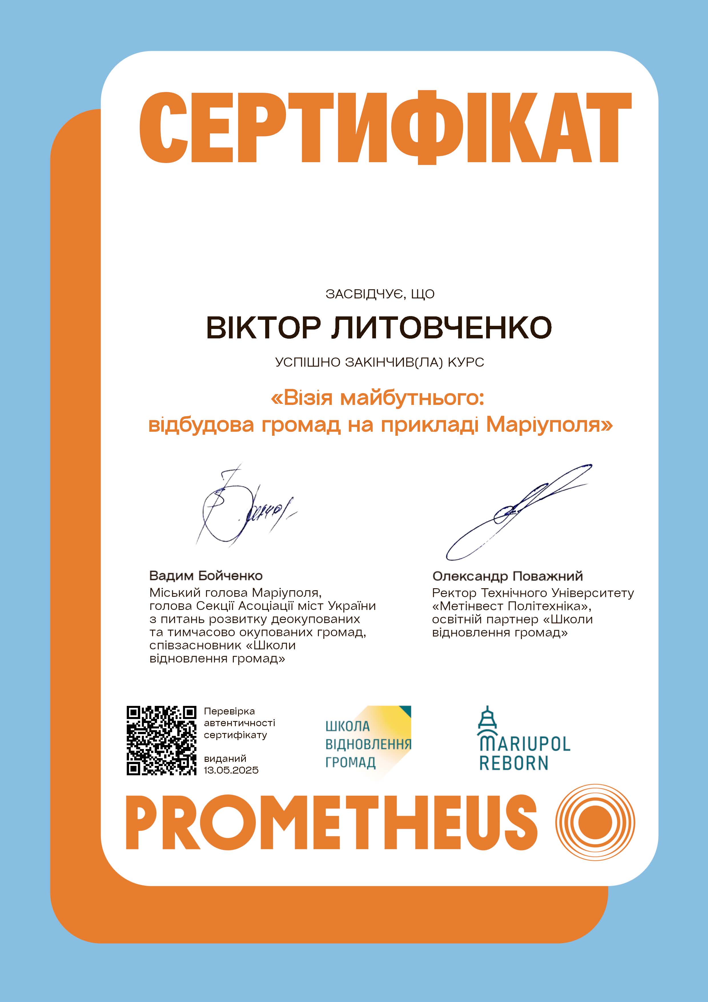 Сертифікат про успішне закінчення курсу «Візія майбутнього: відбудова громад на прикладі Маріуполя» – Prometheus, 13.05.2025.