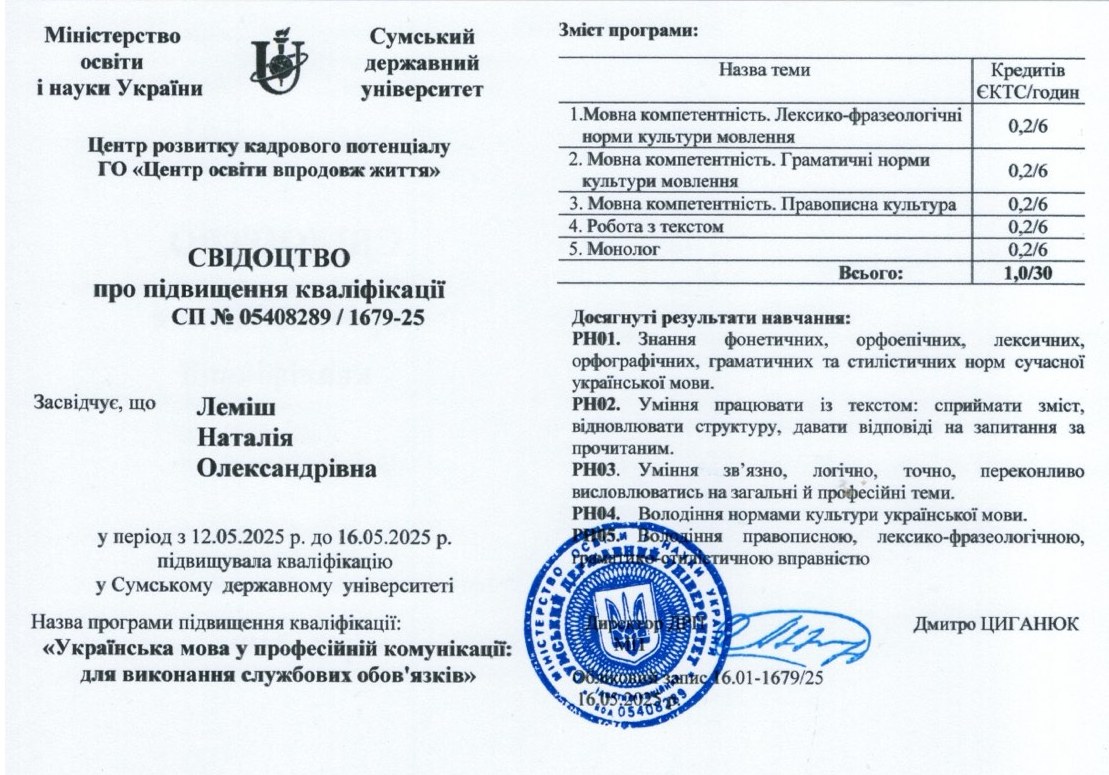 Сумський державний університет, «Українська мова: помічник кожному на щодень», Свідоцтво СП № 05408289 / 1228-24 від 12.04.2024 р., 30 годин / 1 ЄКТС.