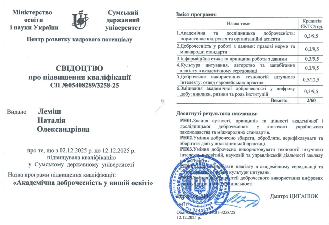Сумський державний університет, «Європейські практики наукової досконалості в цифрову еру», Сертифікат RE25-189 від 07.02.2025 р., 120 годин / 4 ЄКТС.