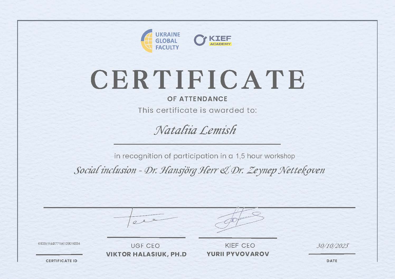 Сертифікат учасника вебінару Social inclusion - Dr. Hansjörg Herr & Dr. Zeynep Nettekoven