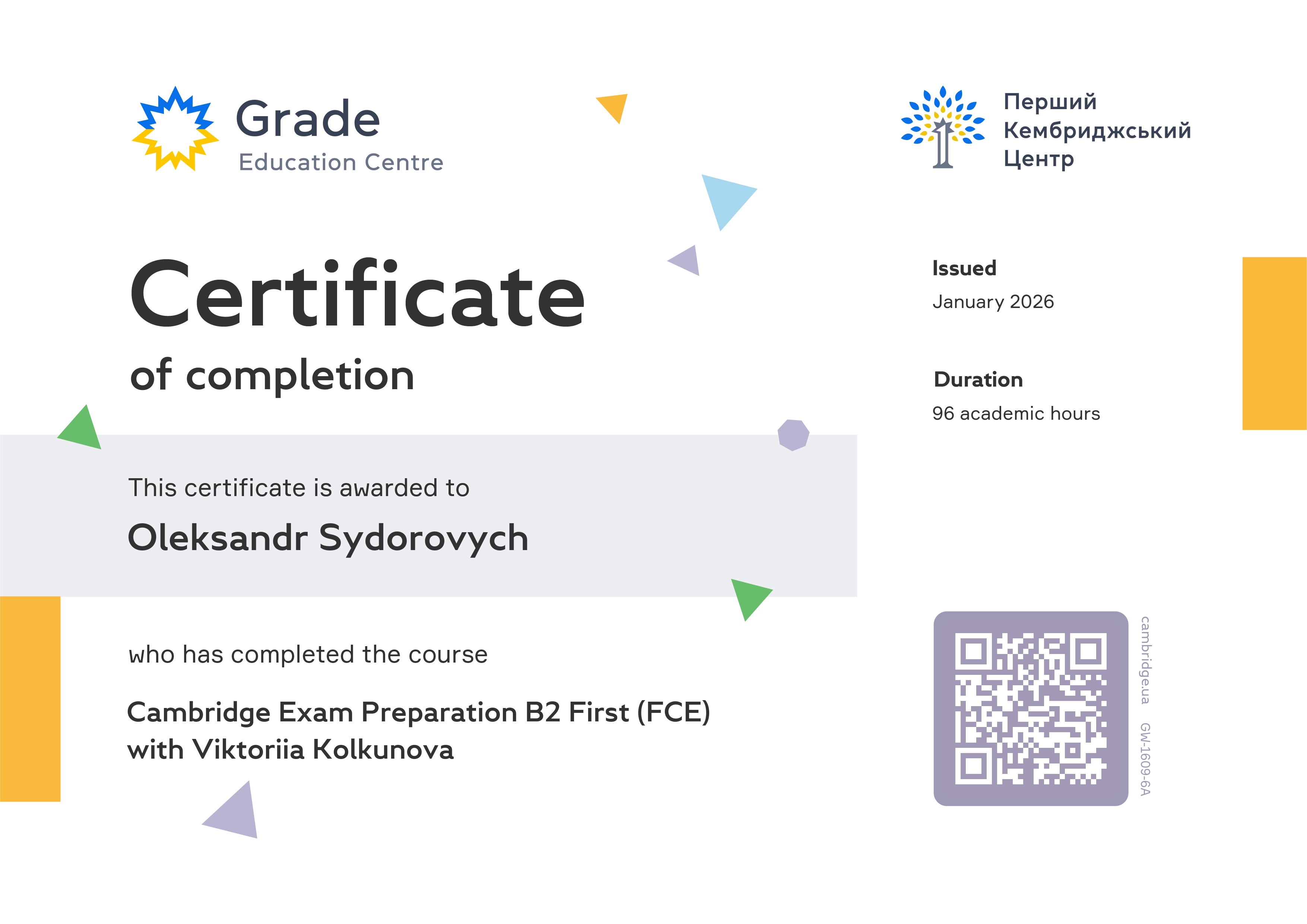 Сертифікат про успішне завершення курсу «FCE Preparation Upper Intermediate Progressive B2.2» - Центр міжнародних екзаменів Grade Education Centre, 72 години, протягом 14.06.2021-11.08.2021р., сертифікат № VX-0507-7S