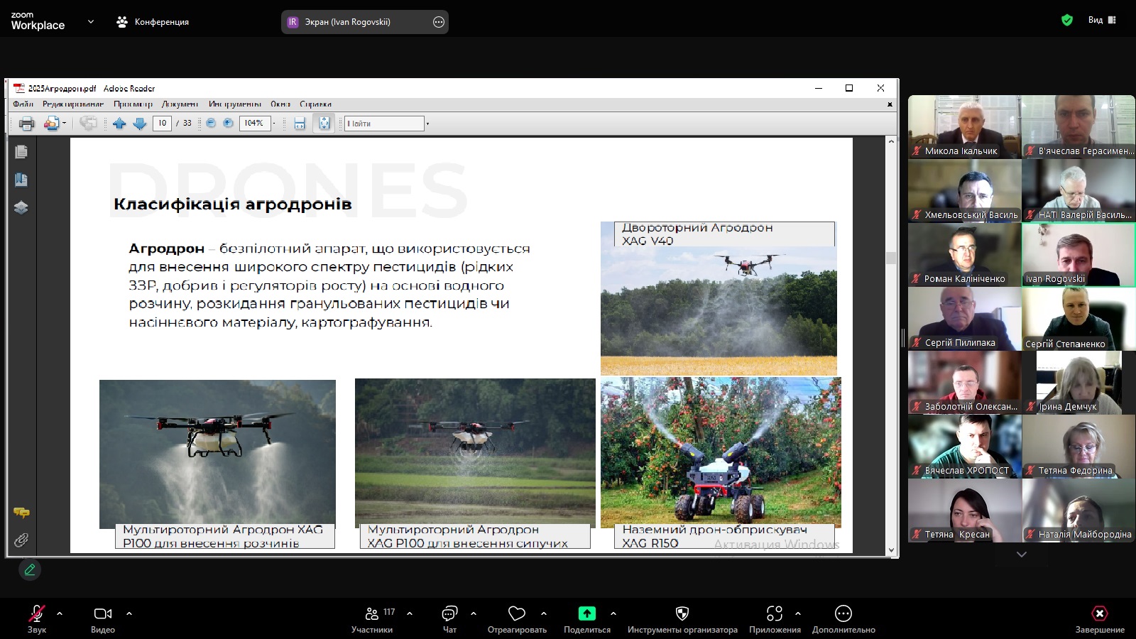 Іван Роговський, д.т.н., професор, декан факультету конструювання та дизайну НУБіП України у своєму виступі «Сучасні тенденції машиновикористання дронів у виробництві сільськогосподарських культур» інформував про те, що за наступні 5 років буде сформовано нову ринкову екосистему навколо використання безпілотних технологій - дронів-обприскувачів. Вимога часу - повна енергетична автономність. Навів переваги використання безпілотних технологій - дронів-обприскувачів, а саме до 95% економія води, до 90% економія пального, до 30% економія пестицидів. Нульове пошкодження: відсутність технологічних колій і пошкодження високорослих рослин. Робота в полі без простоїв після дощу, вночі з безпекою для бджіл, за добу бригада може переміститися на 1000 км.
