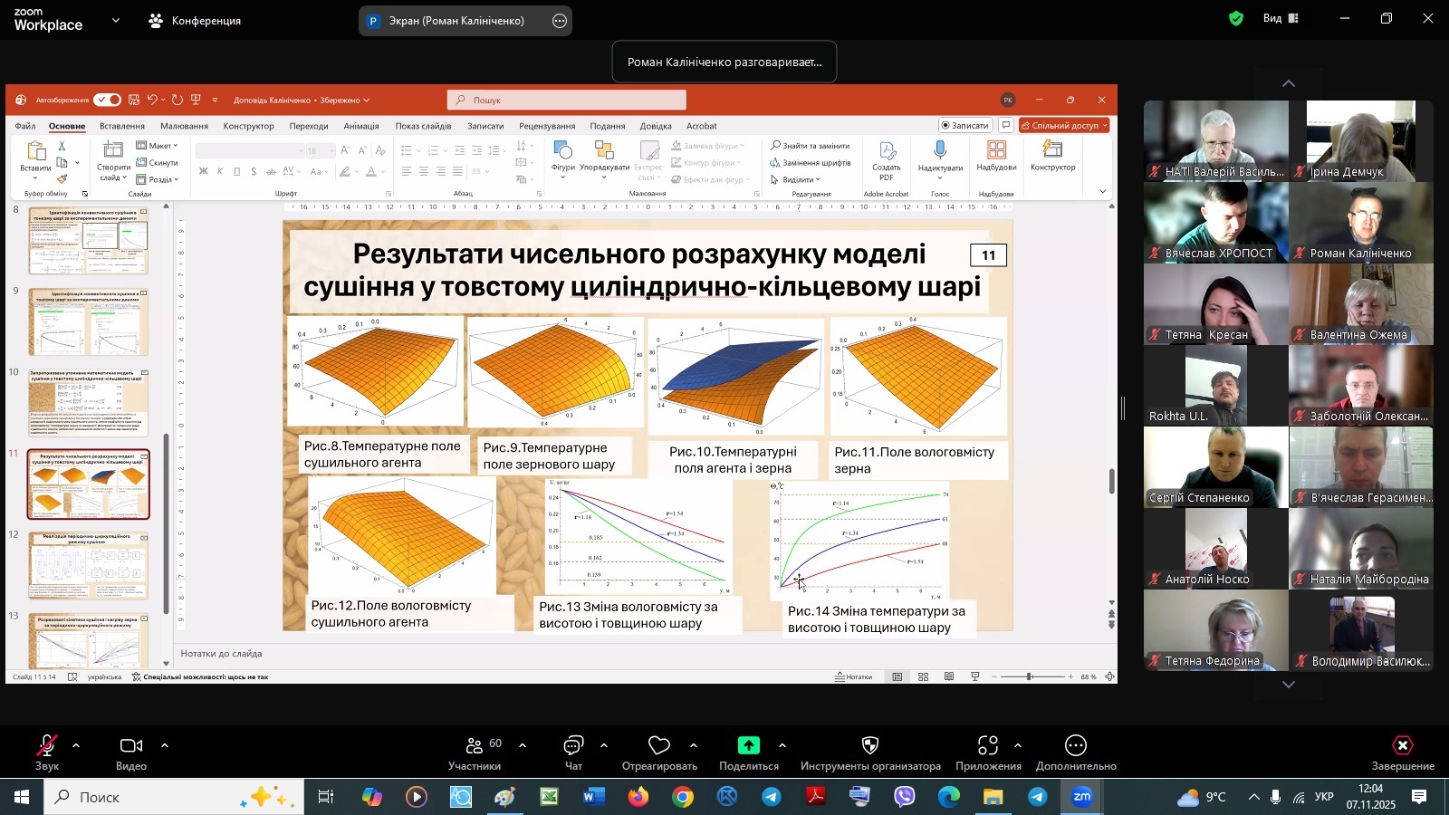 К.т.н., доцент, завідувач кафедри електричної інженерії ВП НУБіП України "Ніжинський агротехнічний інститут" Роман Калініченко у своєму виступі на тему "Математичне моделювання динамічних режимів сушіння зерна у щільному рухомому шарі сушильним агентом із змінними параметрами" відзначив, що математична модель побудована з урахуванням руху шару і змінних параметрів агента, дозволяє адекватно описувати динаміку сушіння зерна у щільному рухомому шарі. Ключовими викликами є коректне параметризування коефіцієнтів масо- та теплообміну, моделювання внутрішньої дифузії вологи та обробка змінних граничних умов. Правильна валідація й налаштування моделі роблять її інструментом для оптимізації режимів сушіння й підвищення якості продукції.