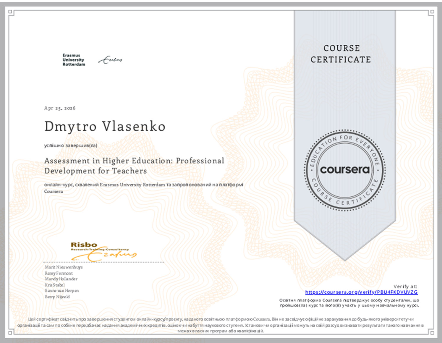 Професор кафедри менеджменту та аграрної економіки, провідний фахівець із забезпечення якості вищої освіти Власенко Дмитро успішно завершив міжнародний онлайн-курс «Assessment in Higher Education: Professional Development for Teachers», Erasmus University Rotterdam та представлений на освітній платформі Coursera.