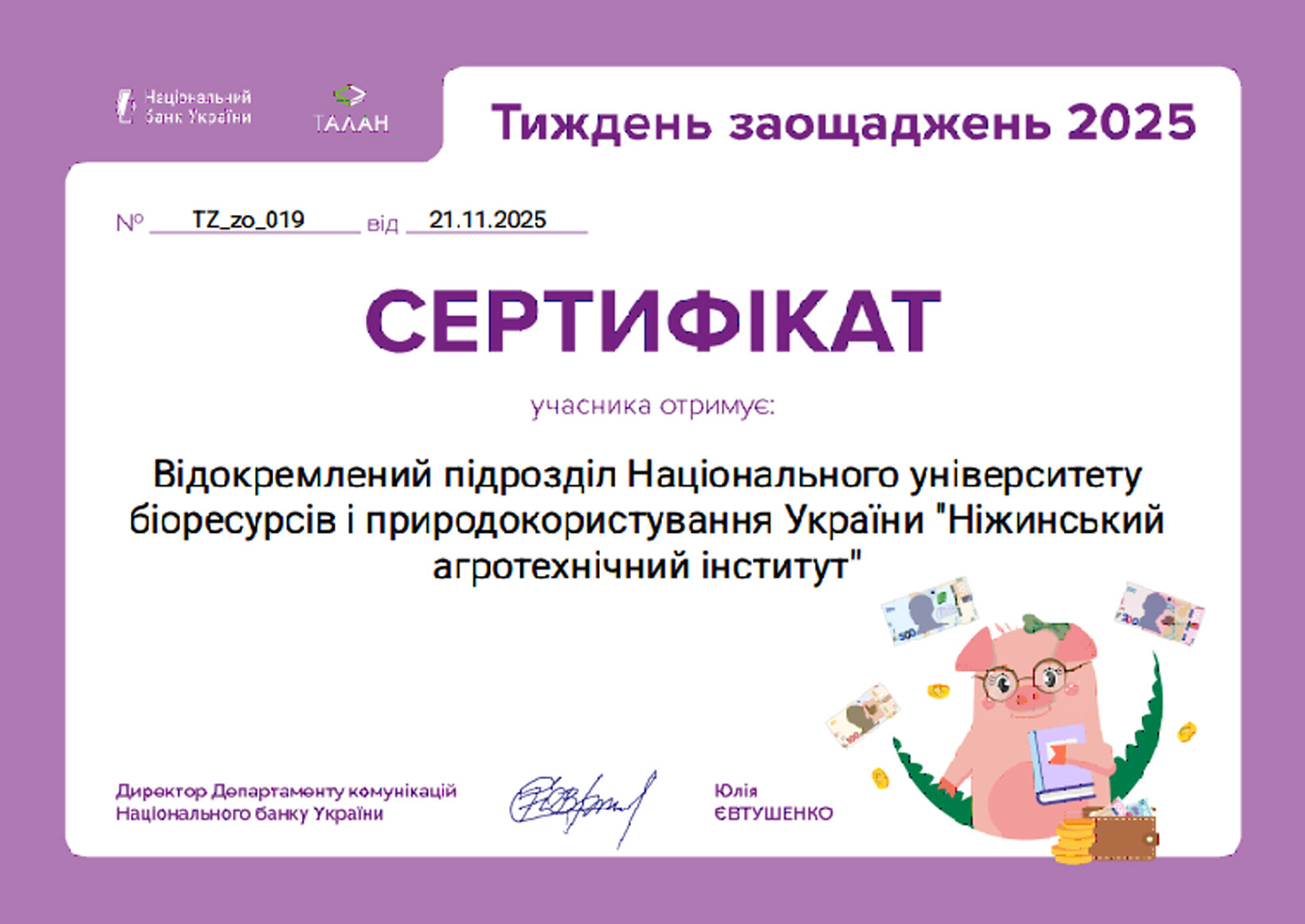 ВП НУБіП України «Ніжинський агротехнічний інститут» отримав сертифікат учасника Тижня заощаджень від Департаменту комунікацій Національного банку України.
