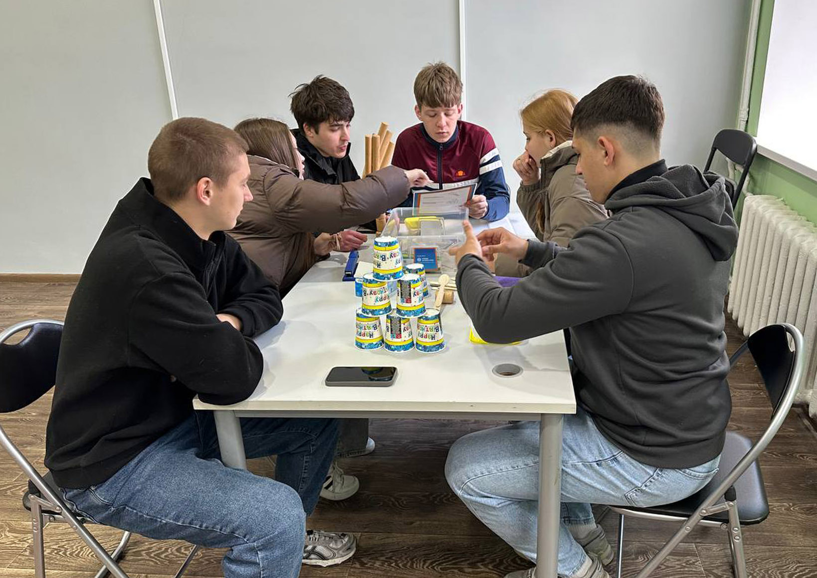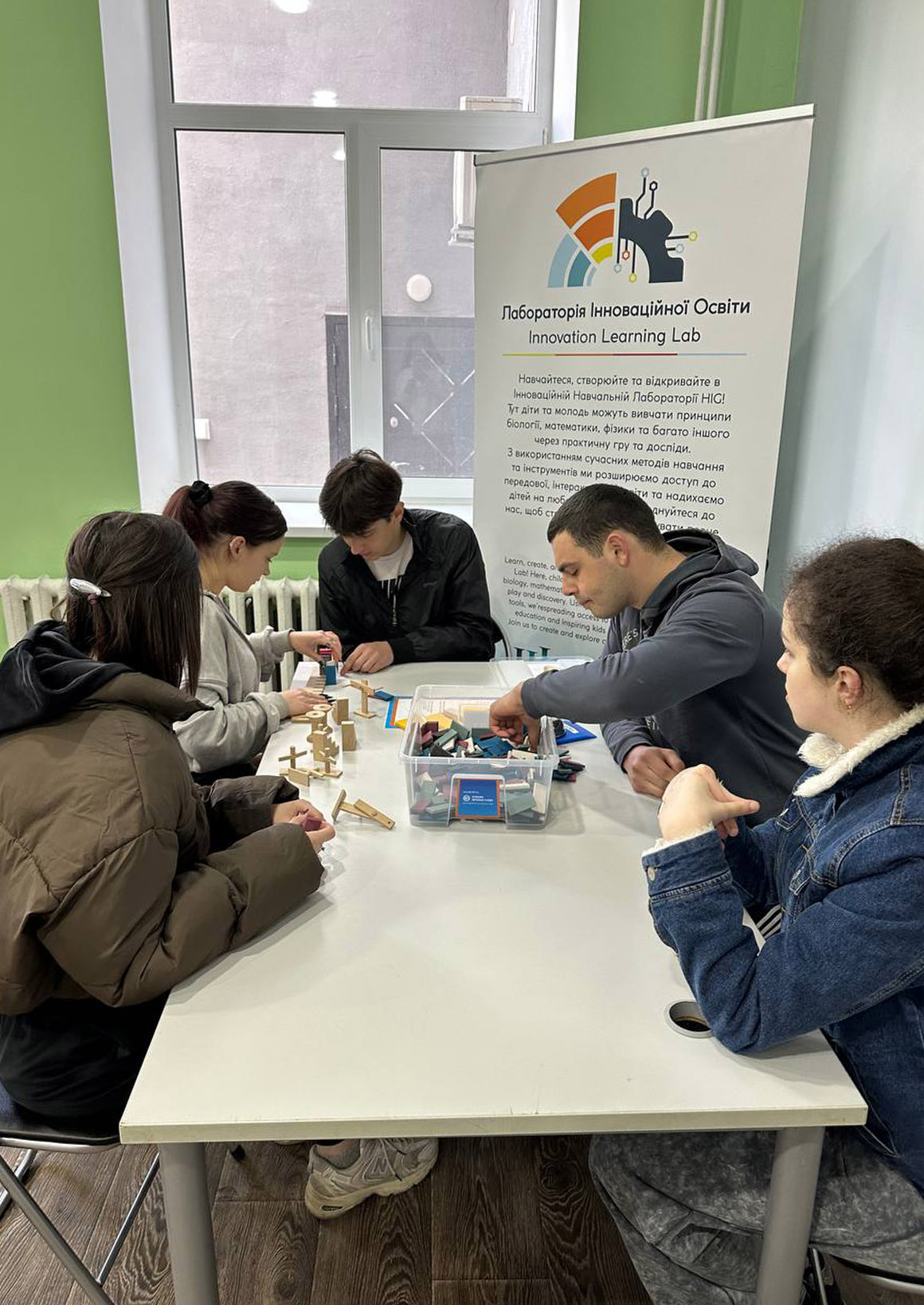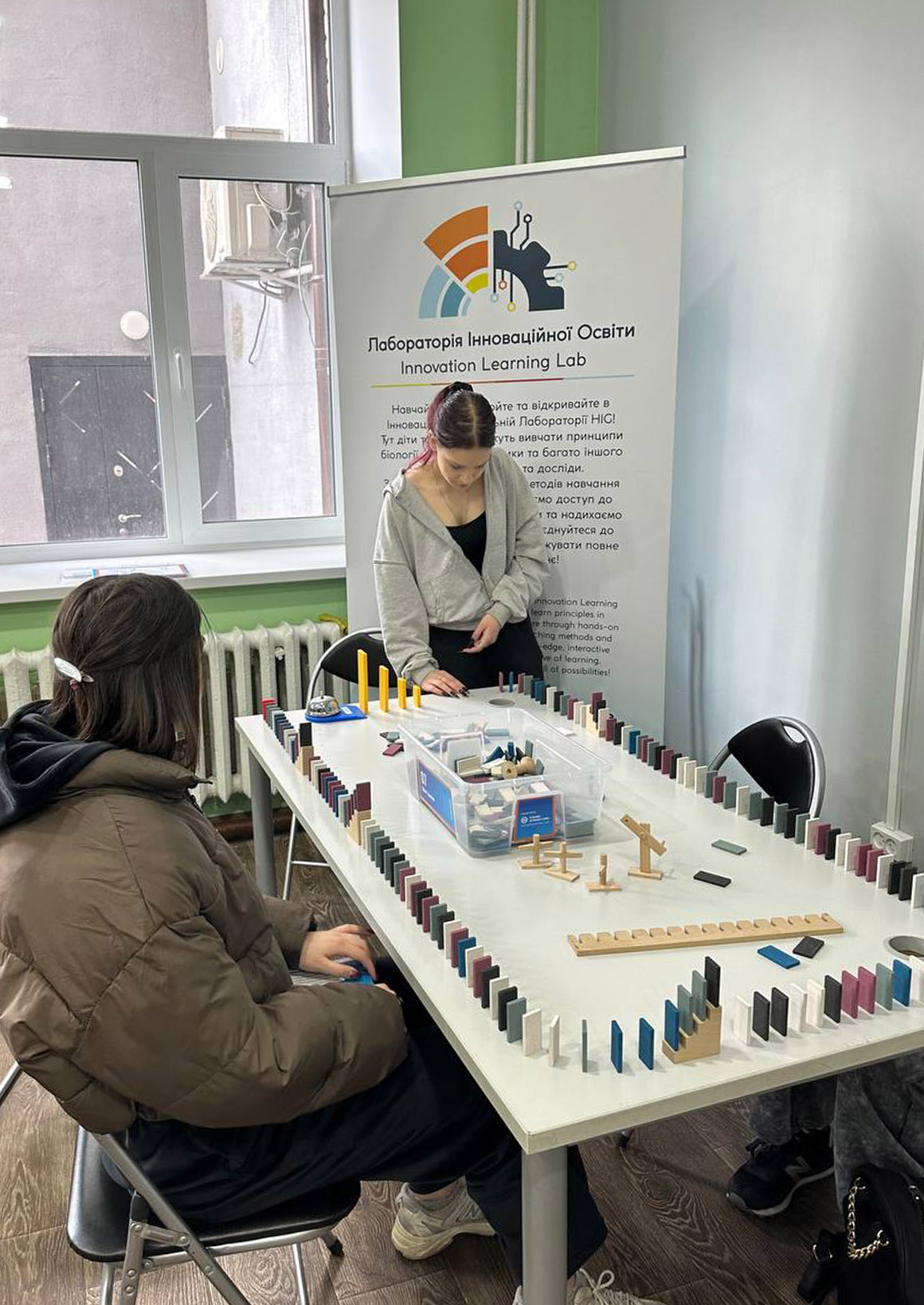 Під час перебування у Зоні креативності, яка функціонує на базі Ніжинської ЗОШ І–ІІІ ступенів №7, студенти долучилися до різноманітних практичних занять. Зокрема, вони досліджували принцип доміно та особливості передачі руху, виконували завдання з вузлами для розвитку просторового мислення і дрібної моторики, а також експериментували з рівновагою тіл і центром мас.