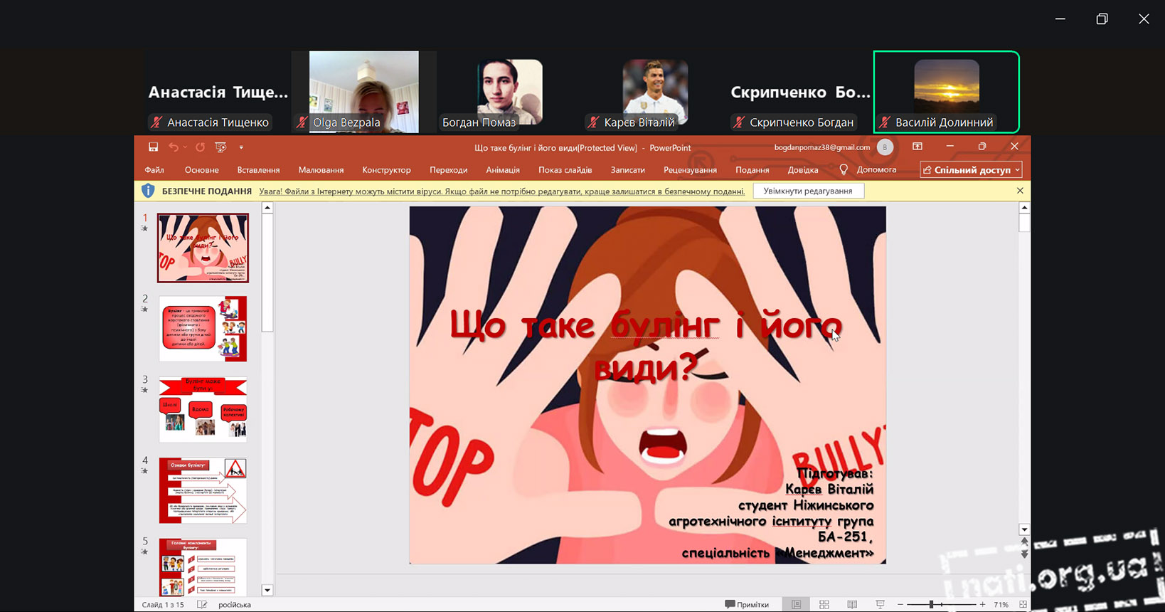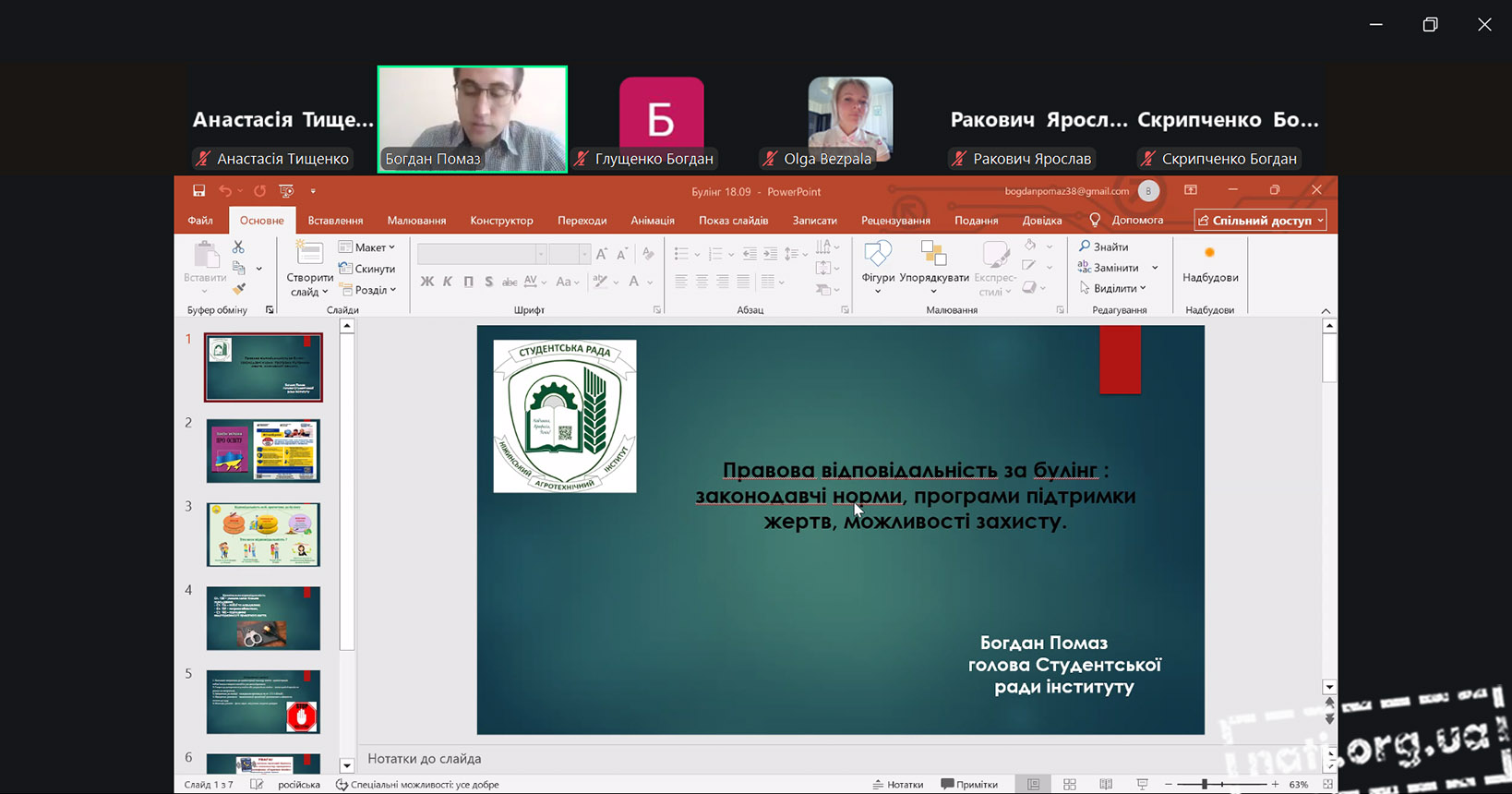Карєв Віталій, студент групи БА251, окреслив сутність явища булінгу та розкрив його види. Карпусь Анна, студентка групи БМК251, зосередила увагу на причинах булінгу та його психологічних наслідках. Ємельянов Дмитро, студент групи БАгр251, пояснив роль свідків у ситуаціях булінгу. Глущенко Богдан, студент групи БАгр251, акцентував увагу на особливостях кібербулінгу як сучасної форми цькування. Помаз Богдан, студент групи БАгр231 та голова студентської ради інституту, висвітлив питання правової відповідальності за булінг, законодавчі норми, програми підтримки жертв і можливості захисту.