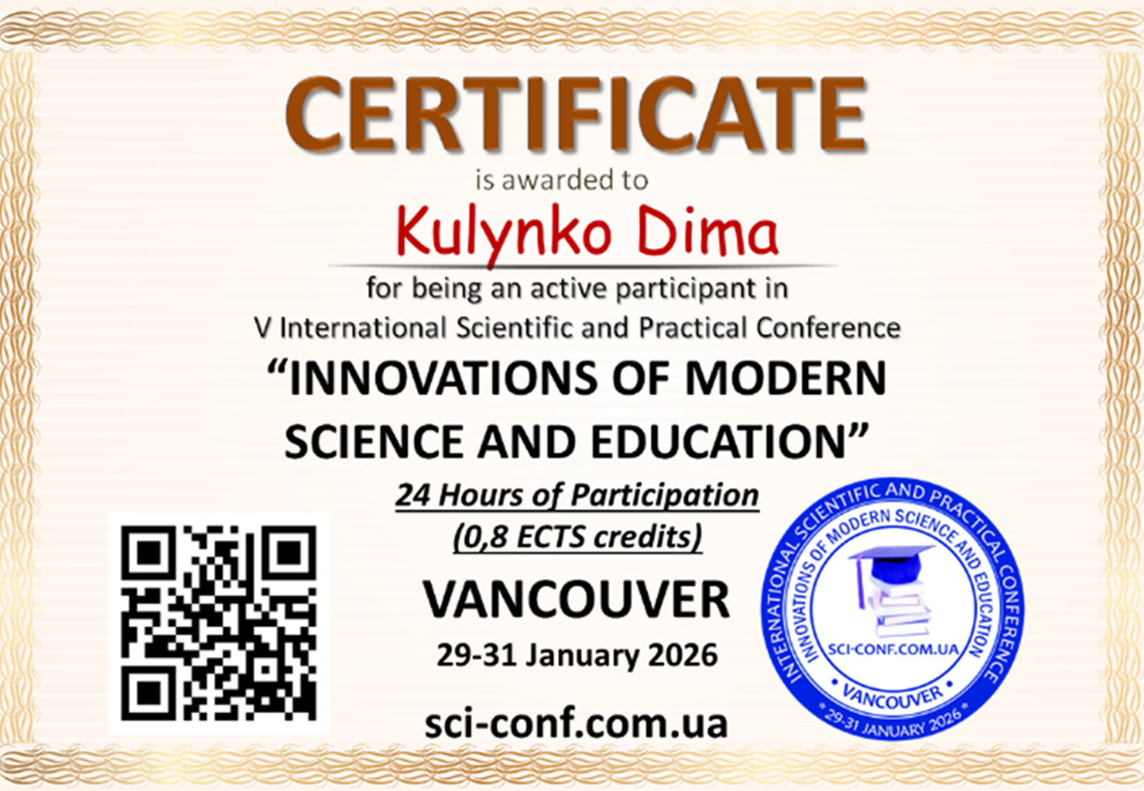 Здобувачі освітньої програми «Менеджмент» Нікіта Костенко та Діма Кулинко долучилися до роботи V Міжнародної науково-практичної онлайн-конференції, що проходила з 29 по 31 січня 2026 року у м. Ванкувер (Канада). У межах конференції вони представили результати спільного дослідження на тему «Цифрова прокрастинація як виклик особистій ефективності в умовах віддаленої роботи». За результатами участі здобувачі отримали сертифікати учасників, а матеріали дослідження опубліковано у збірнику конференції.