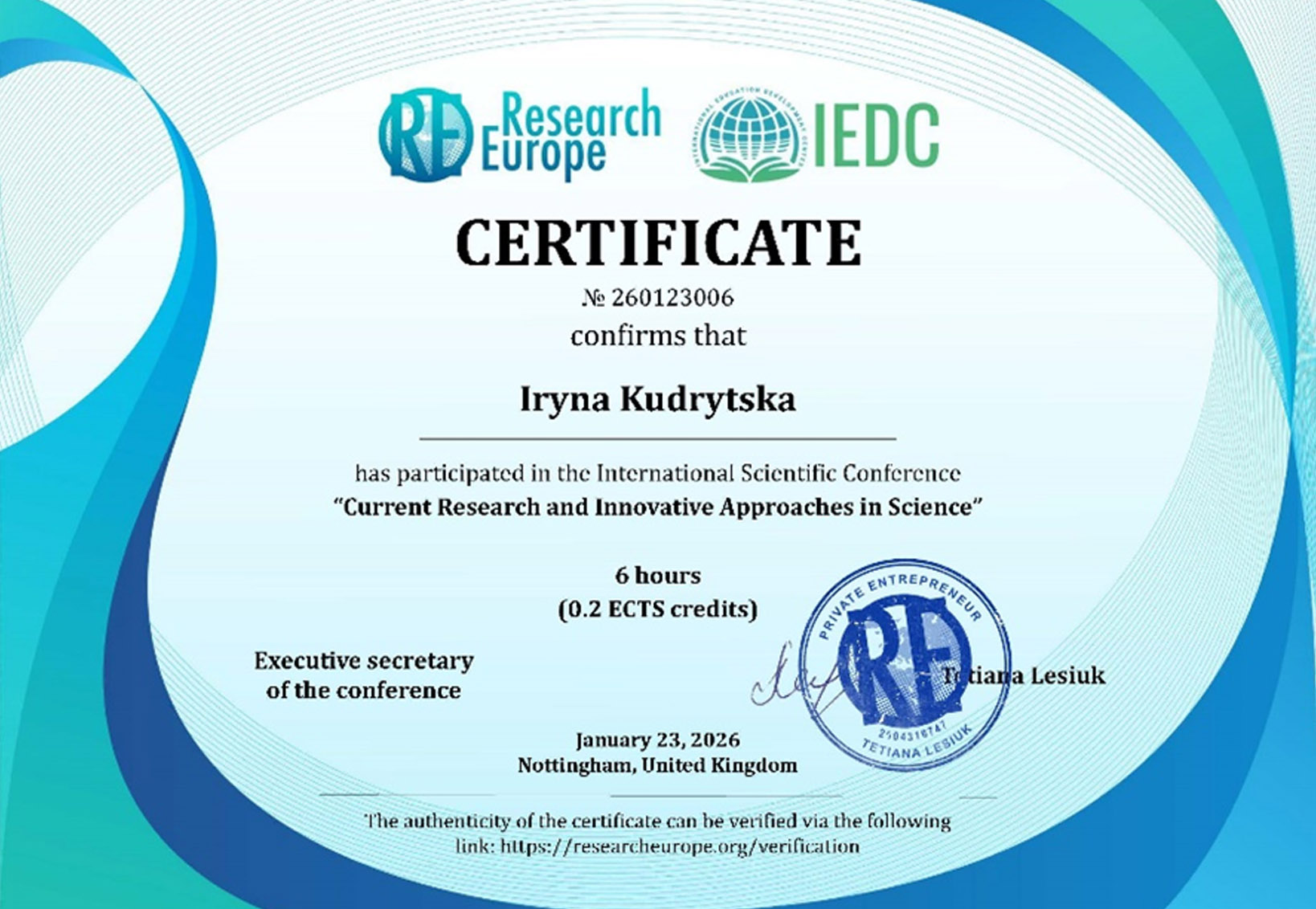Також здобувачка освітньої програми «Менеджмент» Ірина Кудрицька представила доповідь на тему «Матриця Ейзенхауера як інструмент пріоритезації професійних завдань» на Міжнародній науковій конференції «Сучасні дослідження та інноваційні підходи в науці», що відбулася 23 січня 2026 року у м. Ноттінгем (Велика Британія). Результати її наукового дослідження також опубліковано у збірнику матеріалів конференції.
