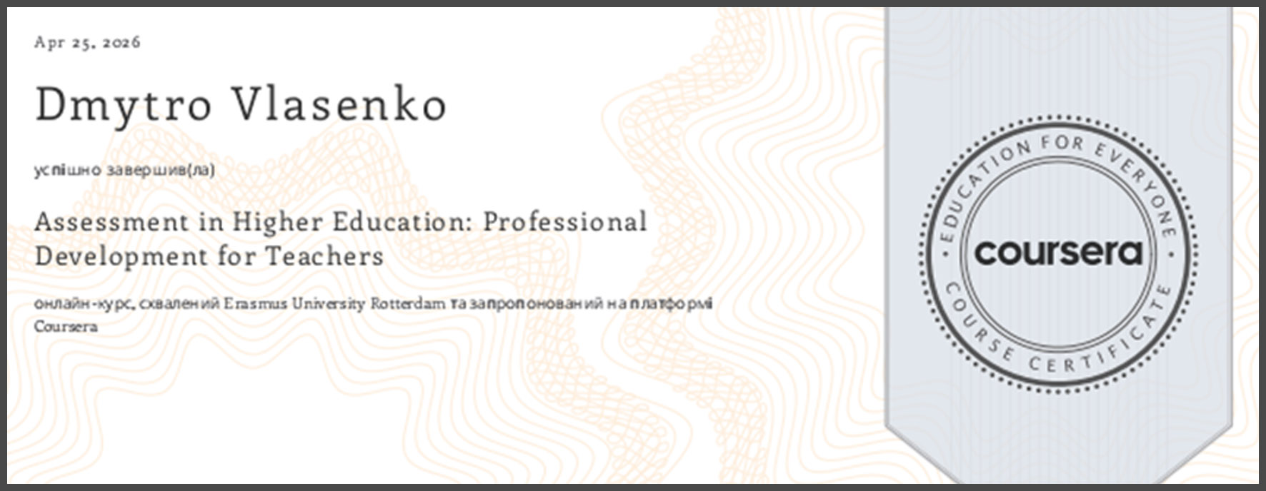 Професор кафедри менеджменту та аграрної економіки, провідний фахівець із забезпечення якості вищої освіти Власенко Дмитро успішно завершив міжнародний онлайн-курс «Assessment in Higher Education: Professional Development for Teachers».